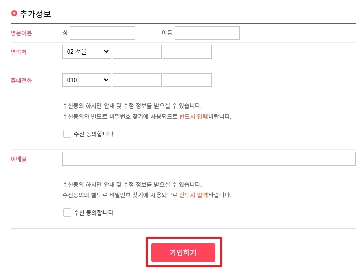 기본정보 입력이 완료되면 영문이름과 휴대전화번호, 이메일과 같이 추가정보를 입력해 줍니다. 입력이 완료되면 하단의 가입하기를 클릭해주면 회원가입이 완료됩니다.
