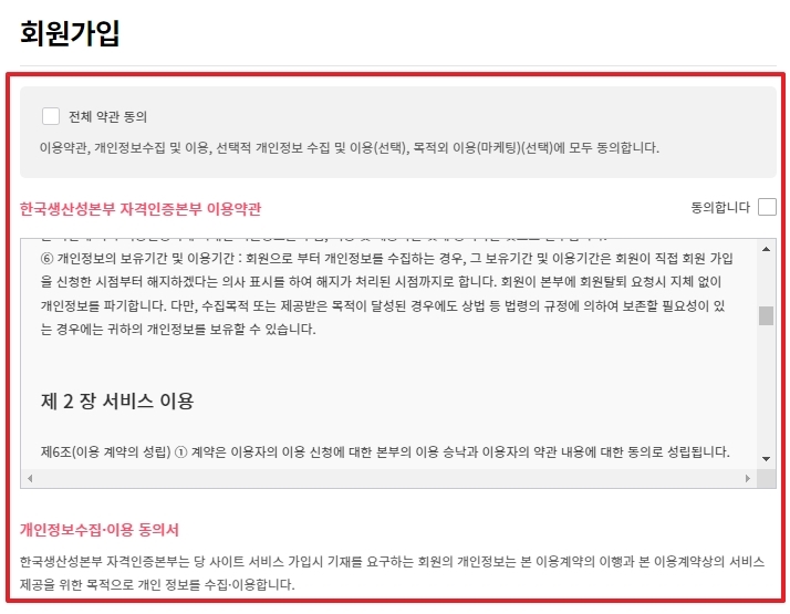 회원가입을 위한 약관을 살펴본 후 전체 약관 동의 체크를 해줍니다.