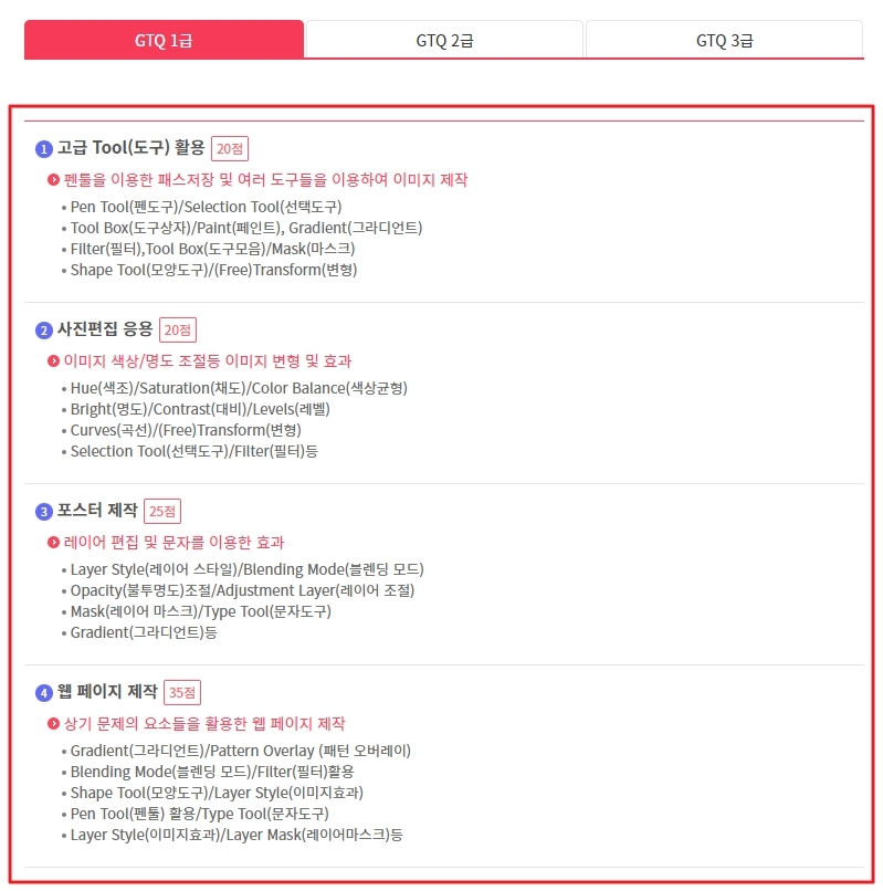 GTQ 1급을 기준으로 시험출제기준을 살펴보도록 하겠습니다. GTQ 1급의 경우 총 4문항이 출제되어지며 각 문항마다 고급 Tool 활용, 사진편집 응용, 포스터 제작, 웹 페이지 제작 능력을 평가하게 됩니다.
