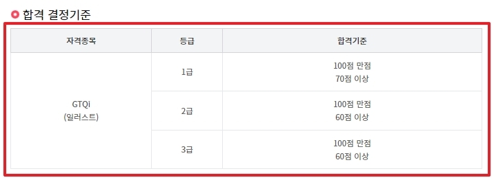 GTQi(일러스트) 합격기준을 살펴보면 1급은 100점 만점 70점 이상이며, 2급과 3급은 100점 만점 60점 이상입니다. 해당 점수 이상을 받으면 합격하게 됩니다.