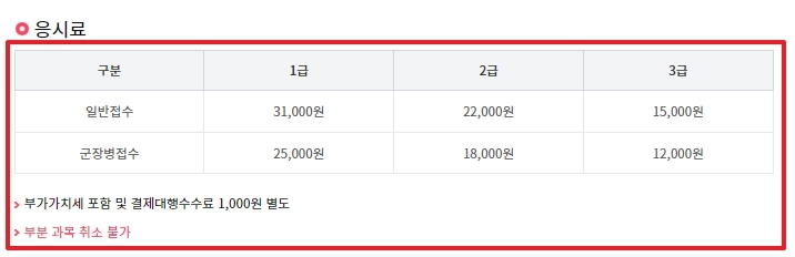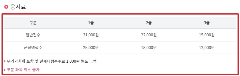 군장병접수 시 1급은 25,000원, 2급은 18,000원, 3급은 12,000원의 응시료를 지불하여 시험에 응시할 수 있습니다.