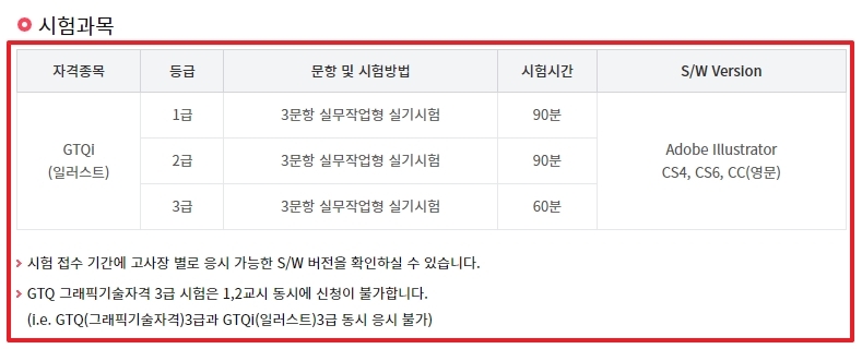 GTQi(일러스트) S/W 버전은 Adobe Illustrator CS4, CS6, CC(영문)가 지원되며 시험장마다 응시 가능한 S/W 버전이 다르니 꼭 확인 후 시험 접수하시기 바랍니다.