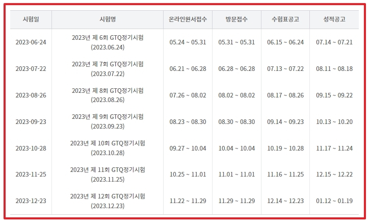 GTQ(그래픽기술자격) 시험은 1월부터 12월까지 매월 넷째주 토요일에 정기시험으로 시행되고 있습니다. 2023년도 GTQ(그래픽기술자격) 시험은 8월 26일, 9월 23일, 10월 28일, 11월 25일 12월 23일 총 5번이 남았으며, 위 접수 기간을 잘 확인하시어 원서 접수하시면 됩니다.