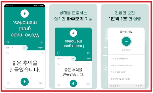 말하는 번역기는 상대방이 번역 결과를 보기 쉽도록 거꾸로 보여준다는 장점을 가지고 있습니다. 또한 실시간으로 음성과 텍스트 번역이 이뤄지기 때문에 상대방과 대화를 나누는데 있어 편리합니다.