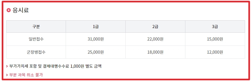 군 장병 접수의 경우에는 1급은 25,000원, 2급은 18,000원, 3급은 12,000원의 응시료를 지불해야 합니다.