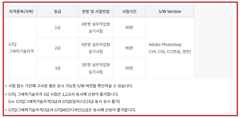 GTQ(그래픽 기술 자격)는 1급, 2급, 3급으로 나누어져 있으며 3급의 경우에는 민간자격으로 구분되어 국가로부터 인정받은 공인자격이 아니라는 점 참고하시기 바랍니다.